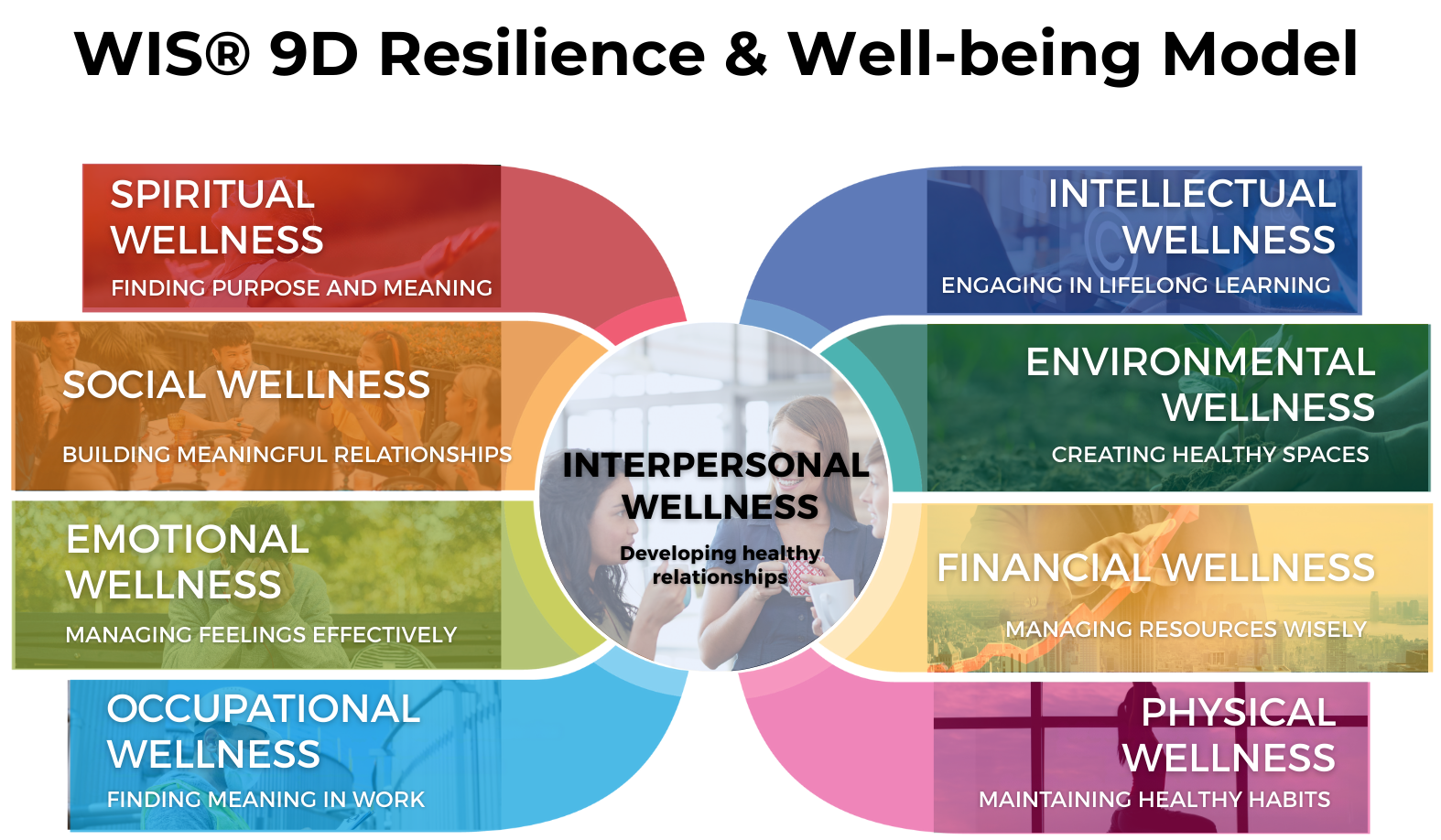 The WIS® Nine-Dimensional Wellness Model. Each dimension is measured independently and as part of the whole, giving you a resilience picture no single workshop or assessment can produce.